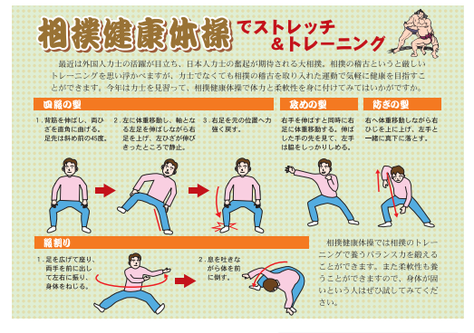 最近は外国人力士の活躍が目立ち、日本人力士の奮起が期待される大相撲。相撲の稽古というと厳しいトレーニングを思い浮かべますが、力士でなくても相撲の稽古を取り入れた運動で気軽に健康を目指すことができます。今年は力士を見習って、相撲健康体操で体力と柔軟性を身に付けてみてはいかがですか。