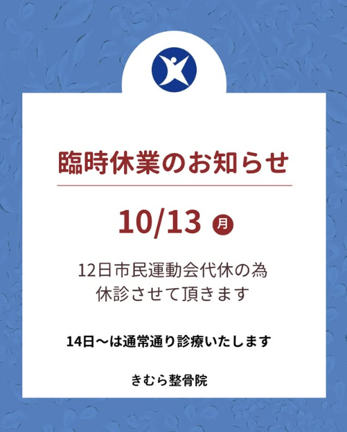そのため 翌日 10月13日(月)を代休 とさせていただきます。