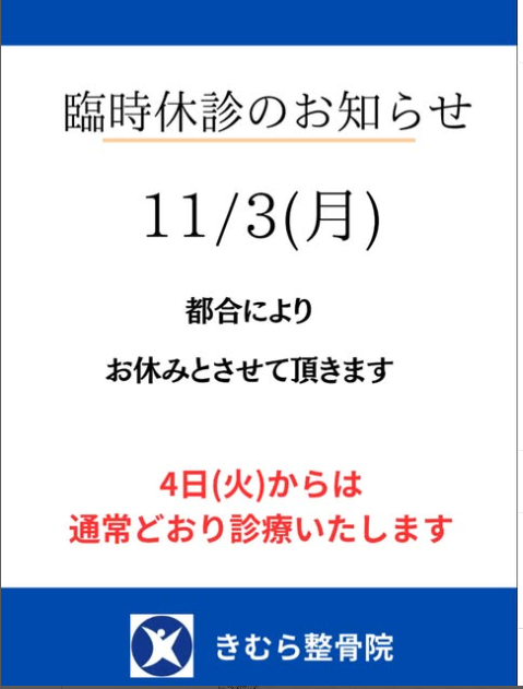 通常は祝日も診療していますが、 11/3(月・祝)は都合により休診させて頂きます